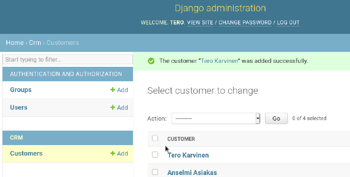 Let's make the admin interface show our customer's names also in list. Edit the existing models.py, where we've described Customer class.
