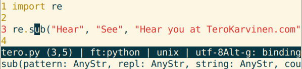 re.sub("Hear", "See", "Hear you at TeroKarvinen.com")