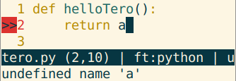 Save with Ctrl-S. Now a warning ">>" appears on the gutter. Move the cursor over the line with warning, 'return a'. Now the full warning is shown at the bottom, on the status line: "undefined name 'a'".