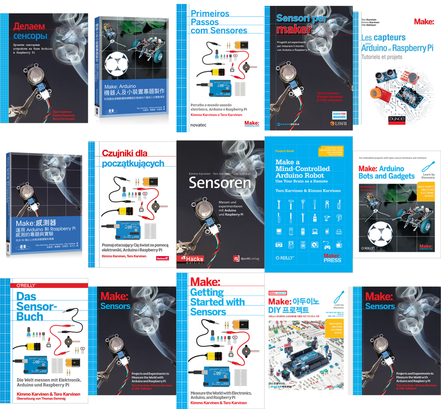 The books are available in Chinese complex, Chinese simplified, English, Finnish, French, German, Italian, Korean, Polish, Portuguese, Romanian, Russian, Thai and Turkish. One of the books is the first Arduino book in Finnish. The books have been co-authored with Kimmo Karvinen and one with Ville Valtokari.